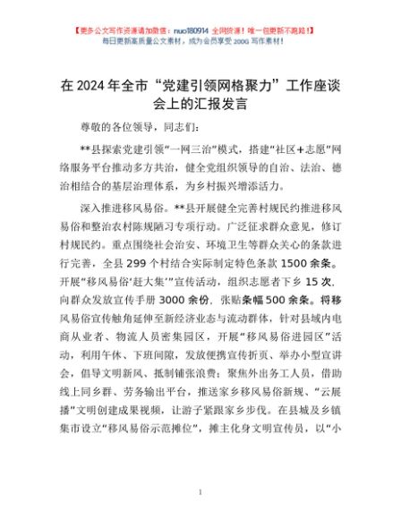 / 在2024年全市“党建引领 网格聚力”工作座谈会上的汇报发言