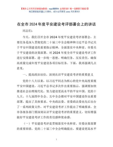 / 在全市2024年度平安建设考评部署会上的讲话