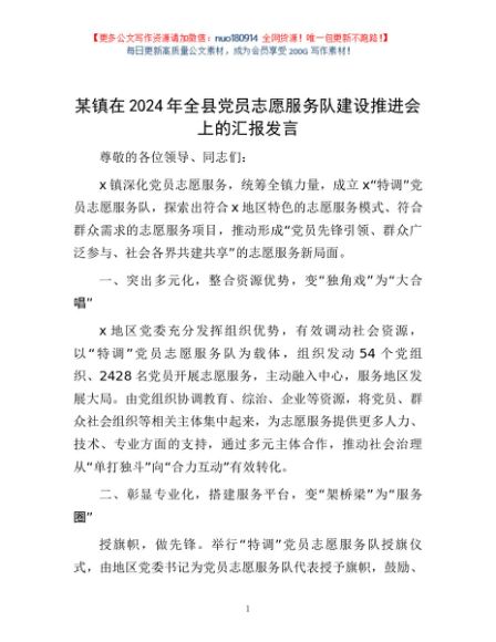 / 某镇在2024年全县党员志愿服务队建设推进会上的汇报发言