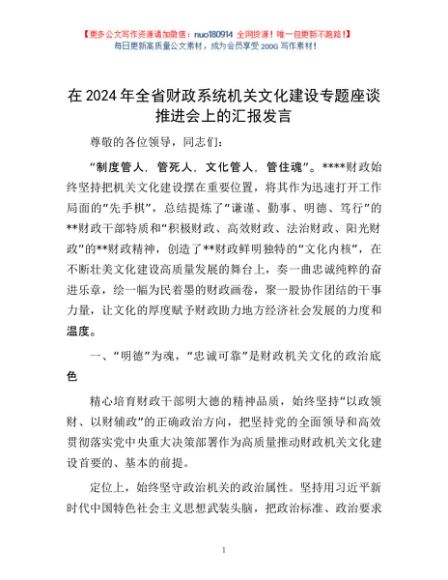 / 在2024年全省财政系统机关文化建设专题座谈推进会上的汇报发言