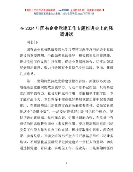 / 在2024年国有企业党建工作专题推进会上的强调讲话