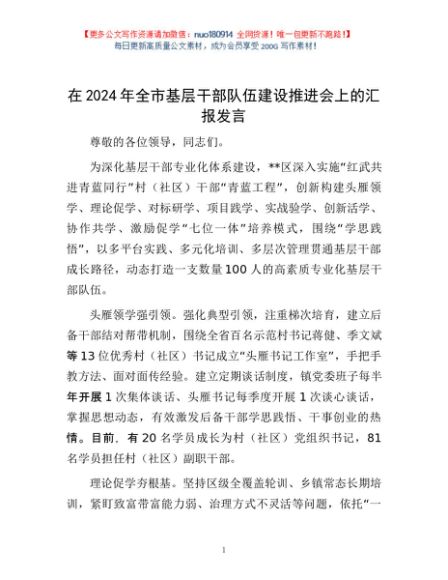 / 在2024年全市基层干部队伍建设推进会上的汇报发言
