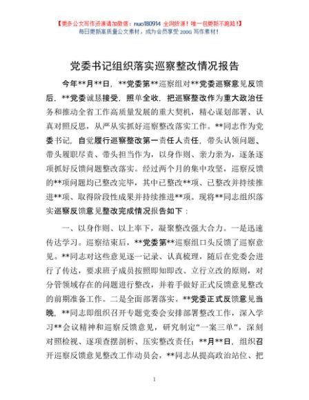 / 党委书记组织落实巡察整改情况报告