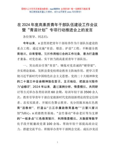 / 在2024年度高素质青年干部队伍建设工作会议暨“青苗计划”专项行动推进会上的发言