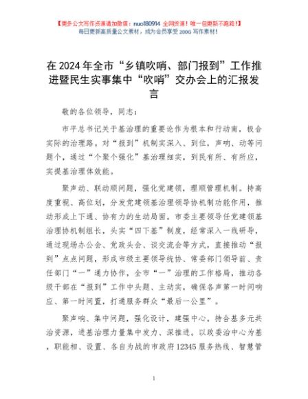 / 在2024年全市“乡镇吹哨、部门报到”工作推进暨民生实事集中“吹哨”交办会上的汇报发言