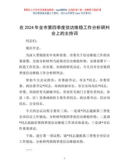 / 在2024年全市第四季度信访维稳工作分析研判会上的主持词