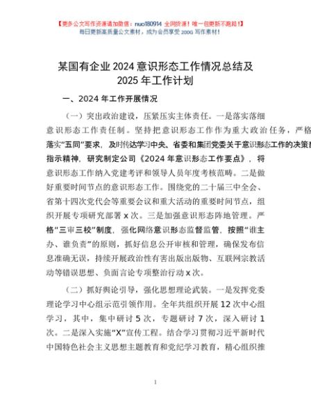 / 某国有企业2024意识形态工作情况总结及2025年工作计划
