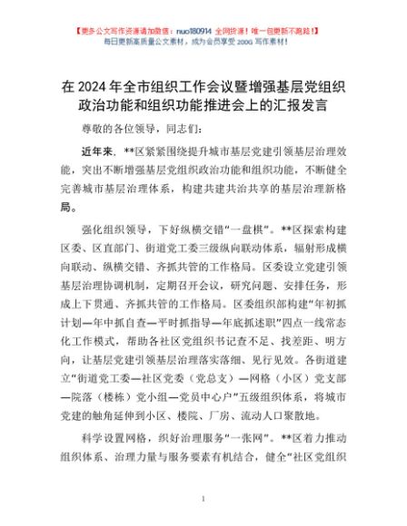 / 在2024年全市组织工作会议暨增强基层党组织政治功能和组织功能推进会上的汇报发言
