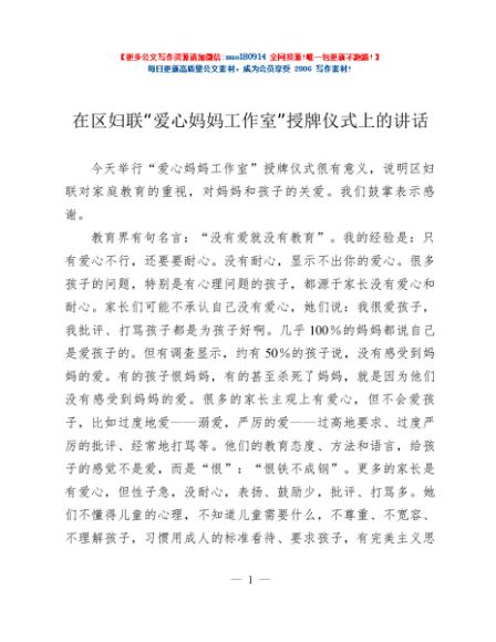 / 在区妇联“爱心妈妈工作室”授牌仪式上的讲话
