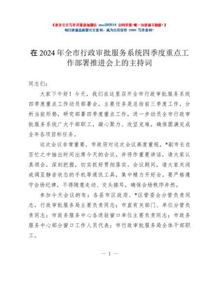 / 在2024年全市行政审批服务系统四季度重点工作部署推进会上的主持词