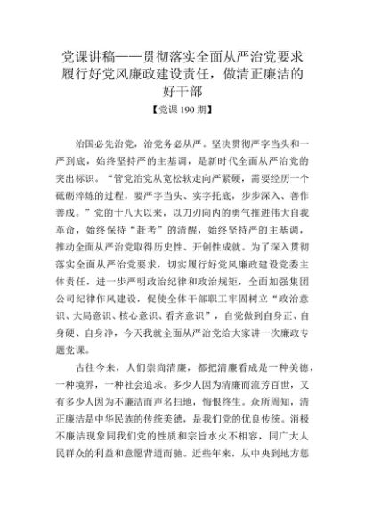 / 党课190期-贯彻落实全面从严治党要求 履行好党风廉政建设责任,做清正廉洁的好干部