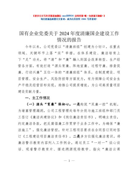 / 国有企业党委关于2024年度清廉国企建设工作情况的报告