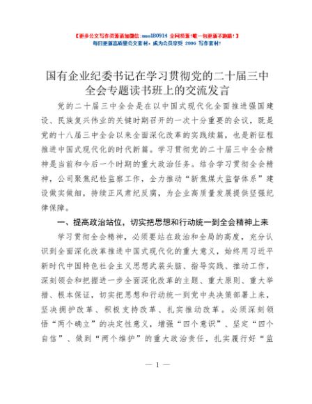 / 国有企业纪委书记在学习贯彻党的二十届三中全会专题读书班上的交流发言