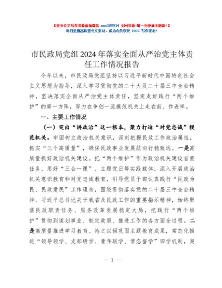 / 市民政局党组2024年落实全面从严治党主体责任工作情况报告