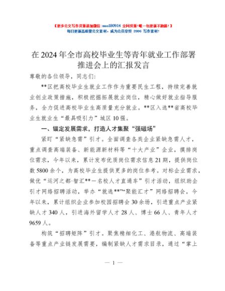 / 在2024年全市高校毕业生等青年就业工作部署推进会上的汇报发言