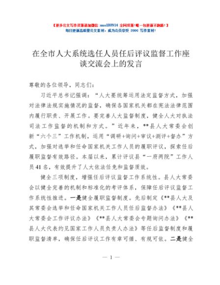 / 在全市人大系统选任人员任后评议监督工作座谈交流会上的发言