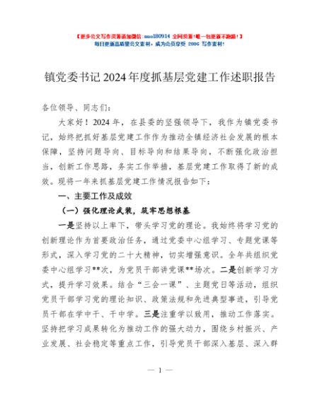 / 镇党委书记2024年度抓基层党建工作述职报告