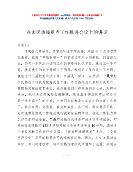 / 在市民热线重点工作推进会议上的讲话