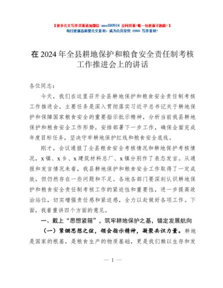 / 在2024年全县耕地保护和粮食安全责任制考核工作推进会上的讲话