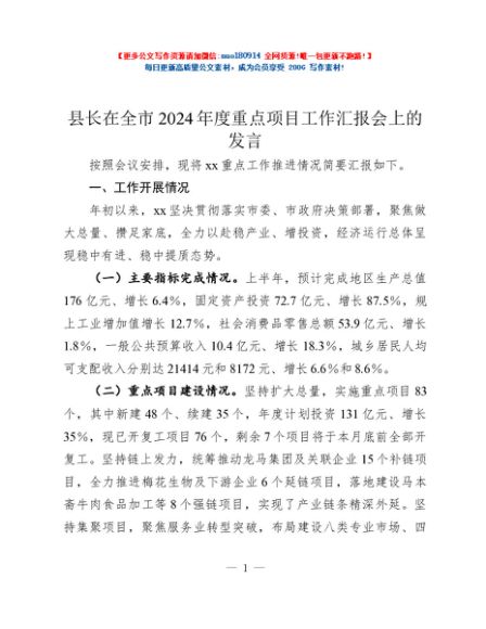 / 县长在全市2024年度重点项目工作汇报会上的发言