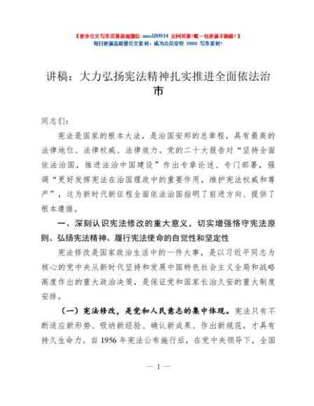 / 讲稿:大力弘扬宪法精神 扎实推进全面依法治市