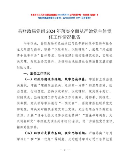 / 县财政局党组2024年落实全面从严治党主体责任工作情况报告