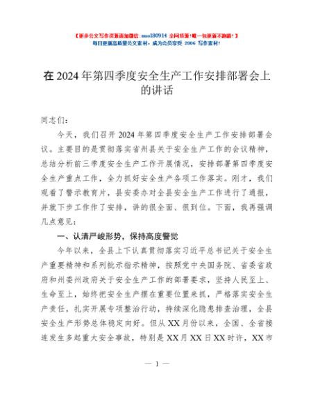 / 在2024年第四季度安全生产工作安排部署会上的讲话