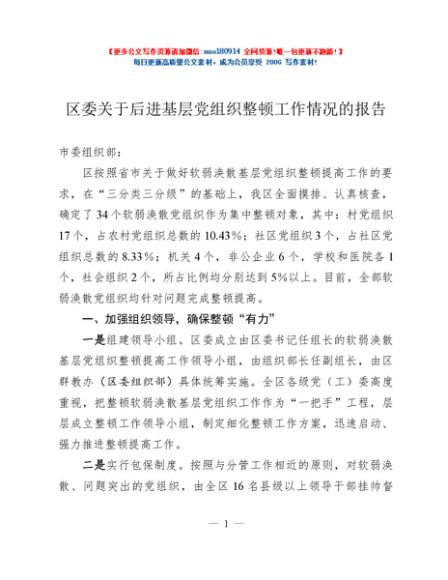 / 区委关于后进基层党组织整顿工作情况的报告
