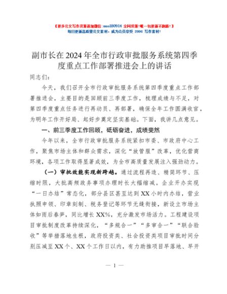 / 副市长在2024年全市行政审批服务系统第四季度重点工作部署推进会上的讲话
