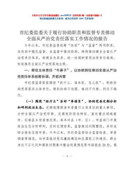 / 市纪委监委关于履行协助职责和监督专责推动全面从严治党责任落实工作情况的报告