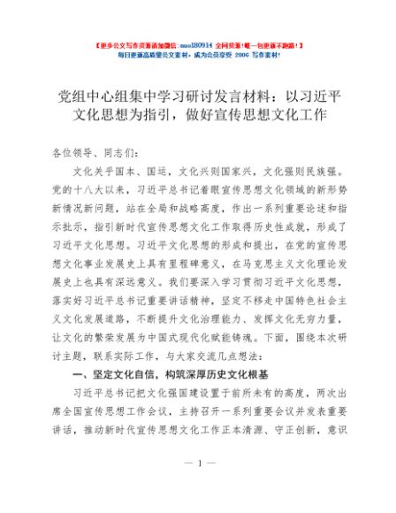 / 党组中心组集中学习研讨发言材料:以习近平文化思想为指引,做好宣传思想文化工作