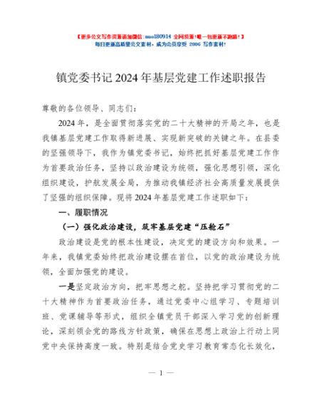 / 镇党委书记 2024 年基层党建工作述职报告