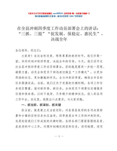 / 在全县冲刺四季度工作动员部署会上的讲话:“三抓、三提”“促发展、保稳定、惠民生”,决战全年