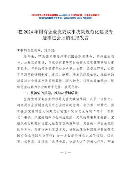 / 在2024年国有企业党委议事决策规范化建设专题推进会上的汇报发言