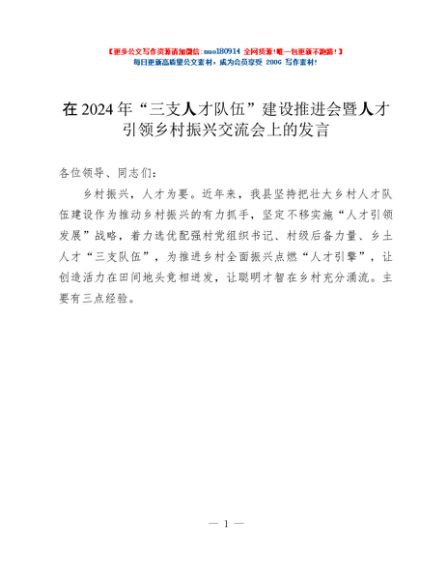 / 在2024年“三支人才队伍”建设推进会暨人才引领乡村振兴交流会上的发言
