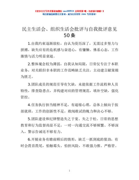 / 民主生活会、组织生活会批评与自我批评意见50条