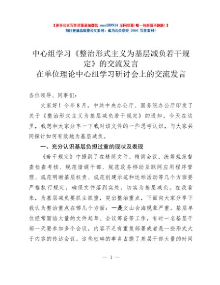 / 中心组学习《整治形式主义为基层减负若干规定》的交流发言