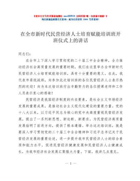 / 在全市新时代民营经济人士培育赋能培训班开班仪式上的讲话