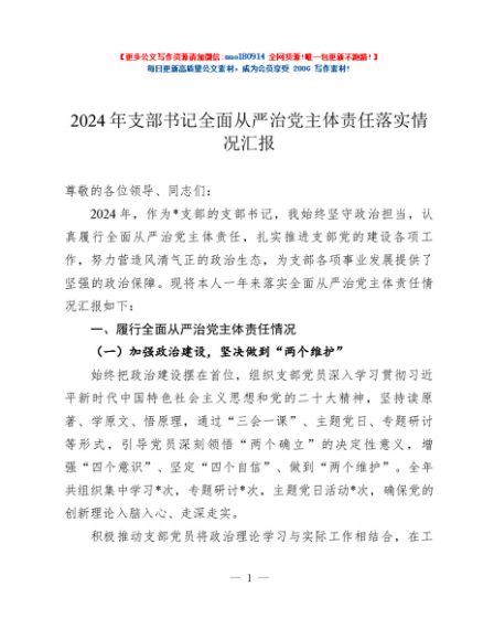 / 2024 年支部书记全面从严治党主体责任落实情况汇报