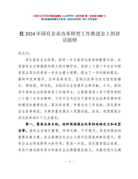 / 在2024年国有企业改革转型工作推进会上的讲话提纲