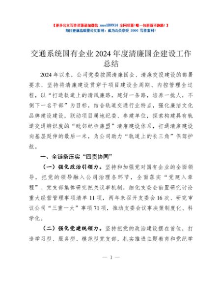 / 交通系统国有企业2024年度清廉国企建设工作总结