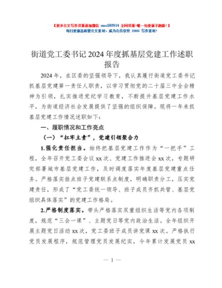 / 街道党工委书记2024年度抓基层党建工作述职报告