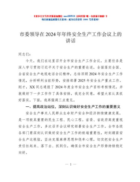 / 市委领导在2024年年终安全生产工作会议上的讲话