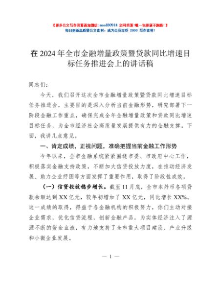 / 在2024年全市金融增量政策暨贷款同比增速目标任务推进会上的讲话稿