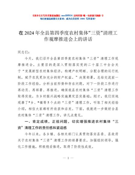 / 在2024年全县第四季度农村集体“三资”清理工作观摩推进会上的讲话