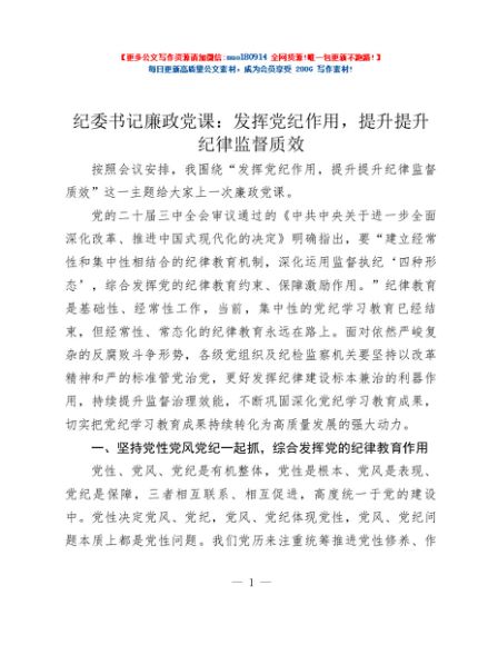 / 纪委书记廉政党课:发挥党纪作用,提升提升纪律监督质效