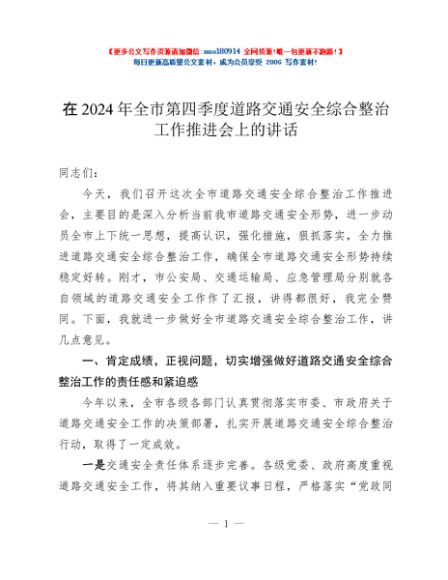 / 在2024年全市第四季度道路交通安全综合整治工作推进会上的讲话