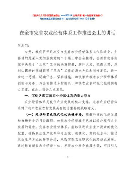/ 在全市完善农业经营体系工作推进会上的讲话