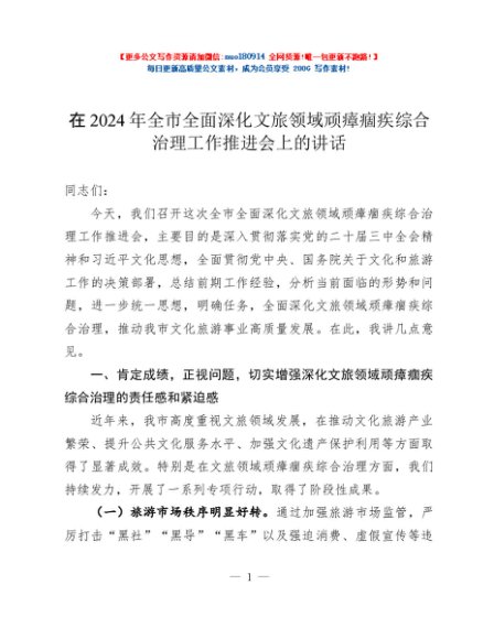 / 在2024年全市全面深化文旅领域顽瘴痼疾综合治理工作推进会上的讲话