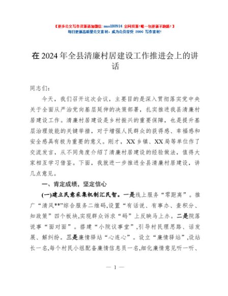 / 在2024年全县清廉村居建设工作推进会上的讲话